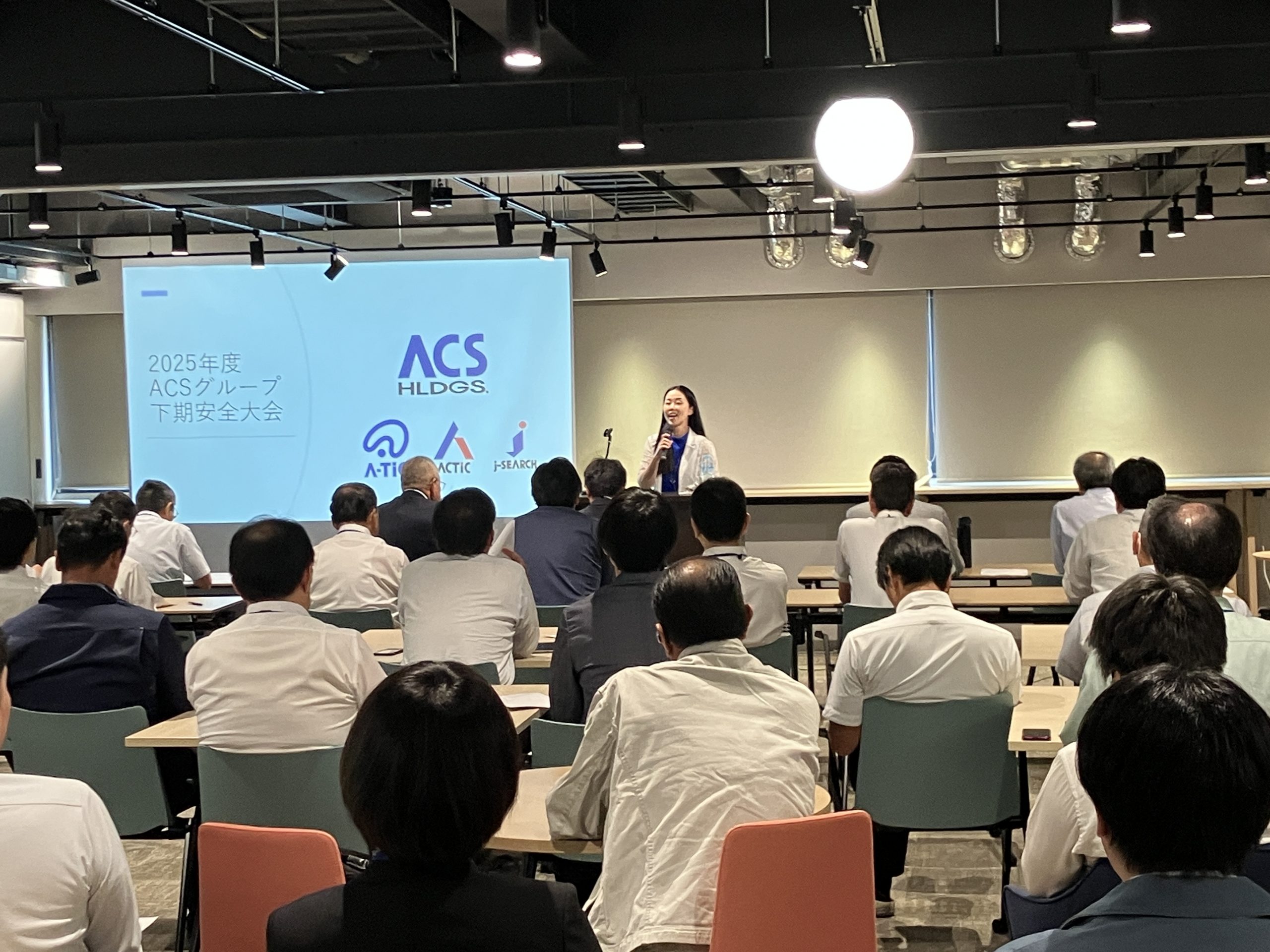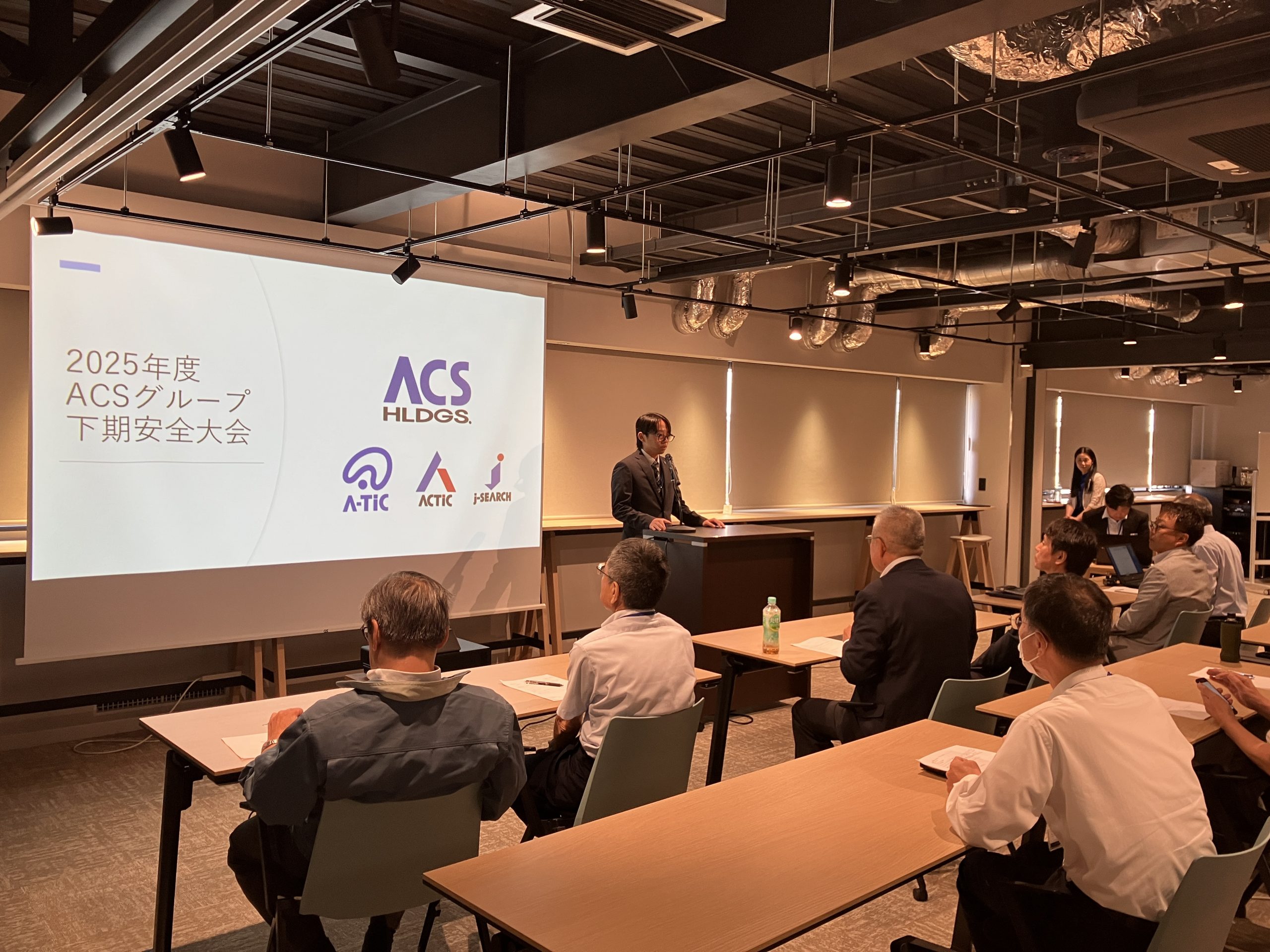 2025年度ACSグループ下期安全大会を9月19日に本社2階協創ラウンジで開催しました。舟田幸太郎社長は、「我々の仕事は何よりも安全が第一。少しでも危ない、このまま進めるともしかしたらという気持ちがあれば、勇気を持って立ち止まる。全作業を止めて、大丈夫かということを確認すること。自分の安全を自分で守り、周りの人間にも声をかけることをしっかり念頭に置いて、この下半期、事故ゼロを続けてほしい」と呼び掛けました。